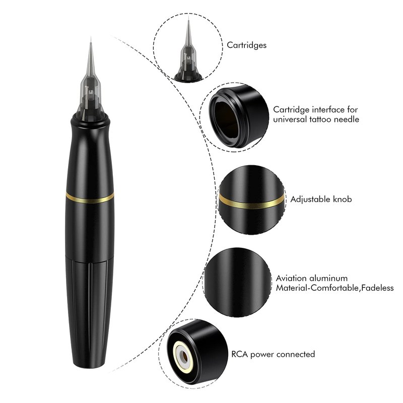 - 【POWERFUL MOTOR AND ADCANCED SYSTEM】This Rotary Tattoo Pen Machine features a powerful motor and an advanced gear system that guarantees reliable, quiet operation, lower noise, less vibration than coil tattoo machine gun. This rotary permanent makeup tattoo machine pen made of aviation aluminum which compatible with all tattoo cartridge needles.