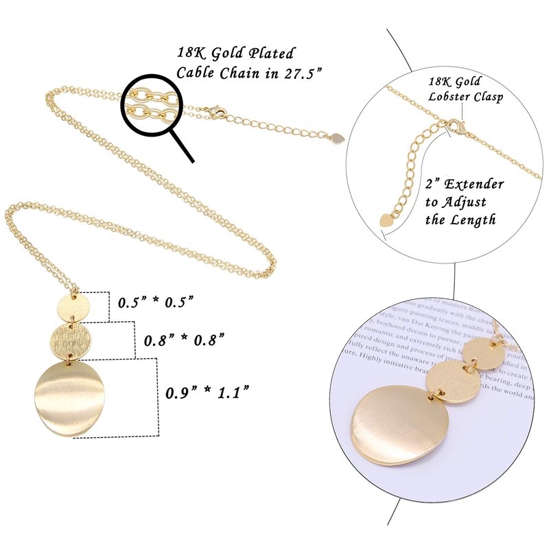 - MATERIALS & SIZE: This long pendant necklace features 3 round brushed discs pendants and 18K gold plated chain. The chain length of the three discs necklace is 27.5” + 2” extender with cable and lobster clasp. The adjustable necklace meets your more needs for wearing it short or long to match your outfit for the day. The sizes of this three coins are 0.5”, 0.8” and 0.9” * 1.1” respectively. This 100% handmade jewelry is lead and nickel free, very comfortable to wear.