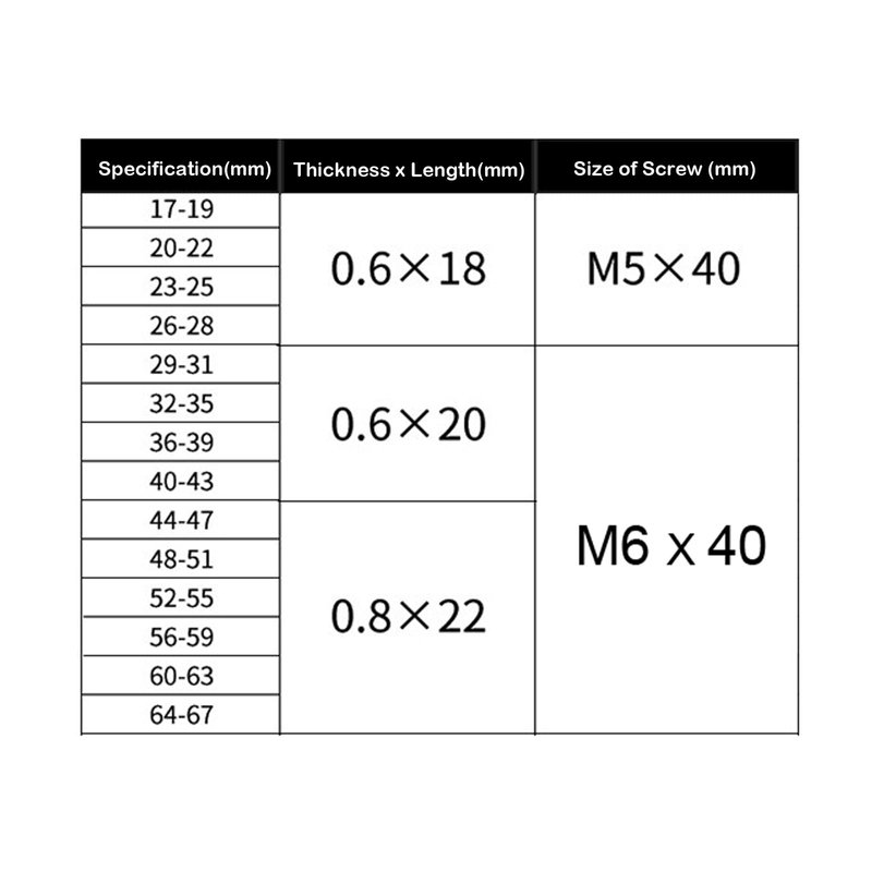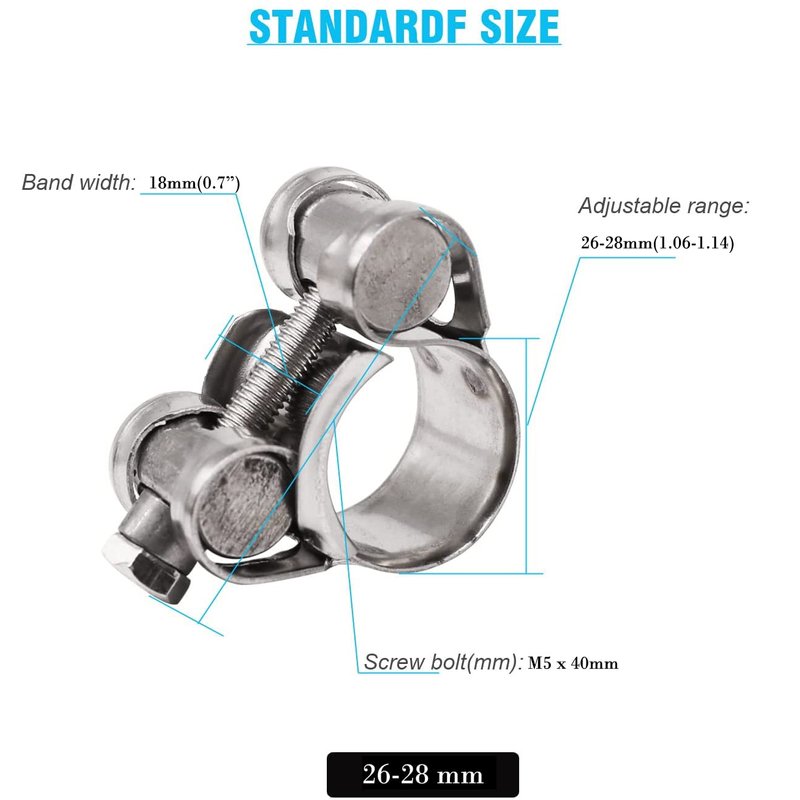 - [ABOUT SIZE]---Turbo pipe clamps adjustable range 26-28mm(1.06-1.14)”, thickness: 0.6mm(0.024”), band width: 18mm(0.7”), screw: M5 x 40mm. please measure the outside diameter of the pipe before purchase our pipe clamp.