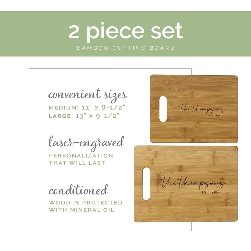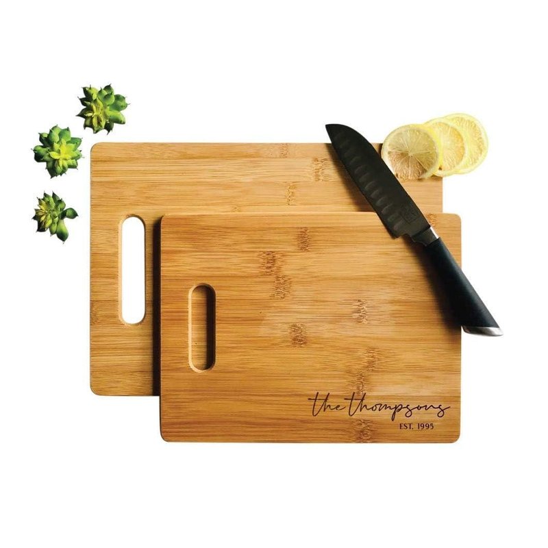 Upgrade your kitchen decor with this handmade bamboo cutting board. The unique rounded end pieces add visual interest, and the board is naturally colored without any harmful synthetic dyes or stains. You can personalize it with an engraving in one of five different designs. With its large size (13" x 9-1/2" x 3/8"), this cutting board is perfect for easy food preparation, and is a durable and eco-friendly alternative to bulky butcher blocks. It makes a great housewarming or wedding gift for your loved ones. Order yours today and enjoy the convenience and style of this personalized bamboo cutting board.