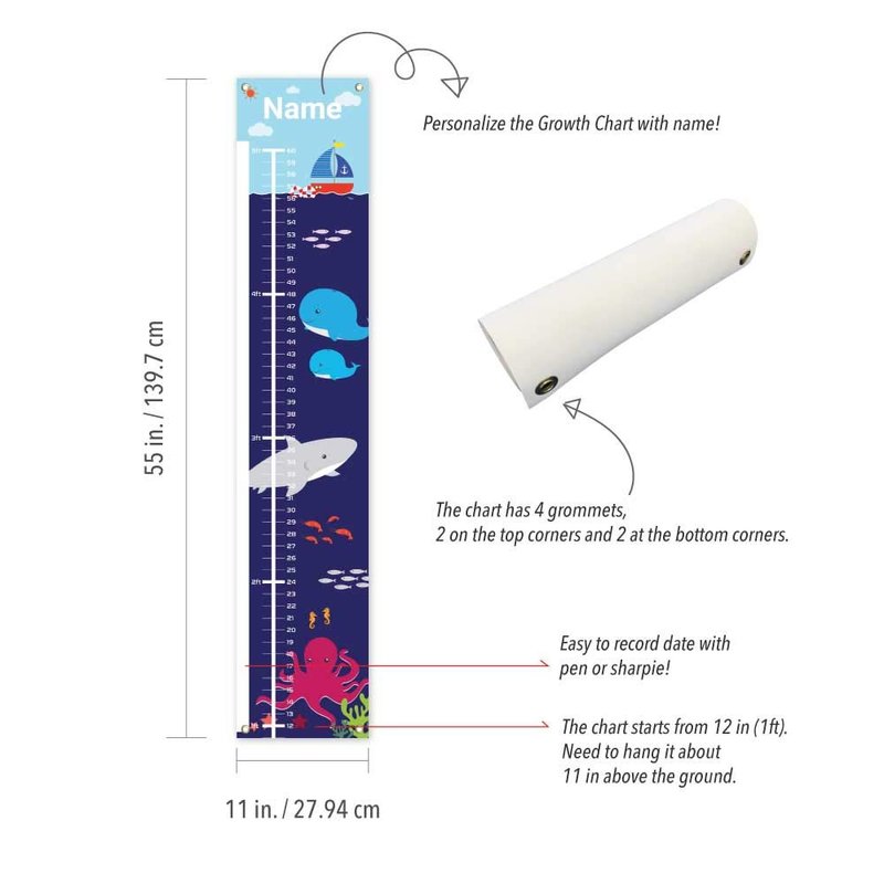 - Growth Chart Size - 55 in (H) X 11 in (W), This growth chart is made with poly canvas (Matte), and this chart has 4 grommets, each corner. It is easy to hang on a wall.