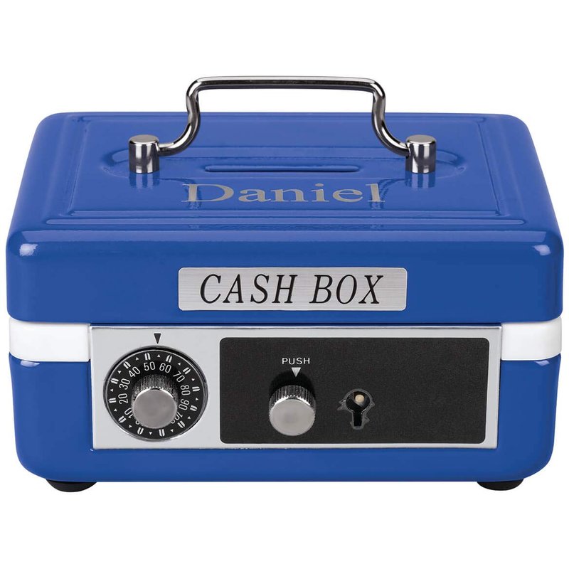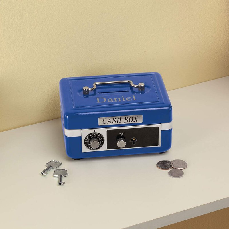 Kids of all ages will be superexcited to have one of our Personalized Kid's Cash Boxes in their lives Our child's lockable box is a great place to stash their allowances and cash gifts from grandparents, aunts, uncles and friends. The doublelock system, which requires both a combination lock and a key operation to open, is tough for siblings to hack. This will make their treasures safe from sticky fingers that may be lurking in the home. (Don't worry, parents: Two keys are included, so you can always hang on to one)Our heavyduty kid's money box features a convenient handle on top, so it is portable and can be taken anywhere your child goes. Inside, they'll love the removable inner tray that has compartments to store not only cash, but also other goodies like baseball cards, notes, jewelry and other special mementos. This box is unlike any other treasure box you'll find online and is a childhood essential for all kids Hint: It makes a great kids' Easter basket gift idea. Please note: At this time, we are only able to personalize characters from the English keyboard.