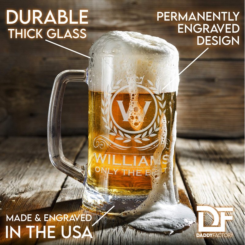 Personalized Custom Beer Mug Glass Cup, Engraved Etched Monogram 16 oz Classic Brew Mug Gift for Dad Drinker