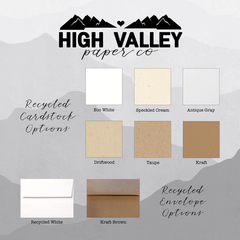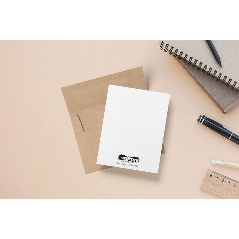 These hand-cut FLAT postcard style cards are approx. 4.25"x5.5". Printed on heavy recycled cardstock. Our logo is printed on the bottom back of the card. Recycled envelopes are included.