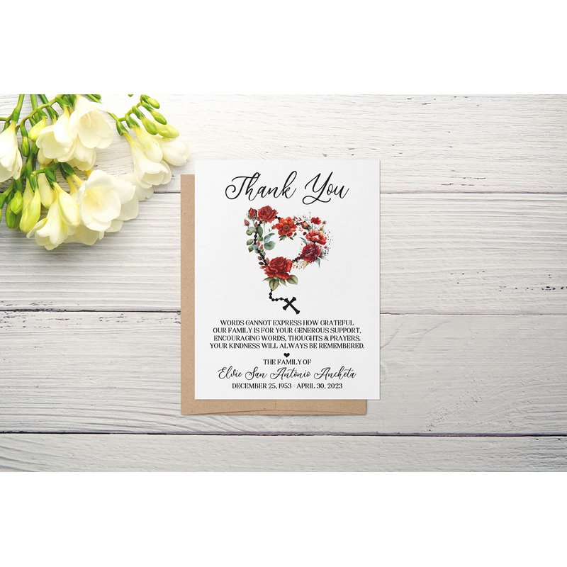 Personalized Funeral Acknowledgement Cards - Heart Rosary Red Floral Cross - Sympathy Thank You Bereavement Flat Notecards - Eco Friendly
