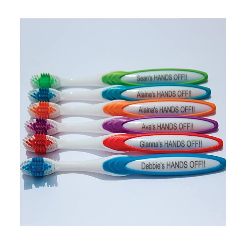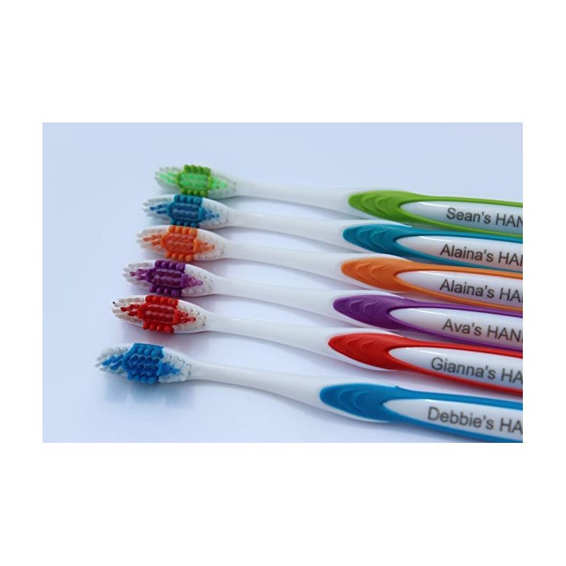 Laser Engraved with Any Name or Message up to 25 Characters with a choice of 3 fonts we know look great. Perfect gift for all the family including Vacations, Sleep overs, visiting family members etc Personalized Adult Manual Toothbrush available in Blue, Purple, Orange, Green, Light Blue and Red Every Toothbrush uses the finest nylon bristles, expertly rounded and polished to protect your gums and teeth.