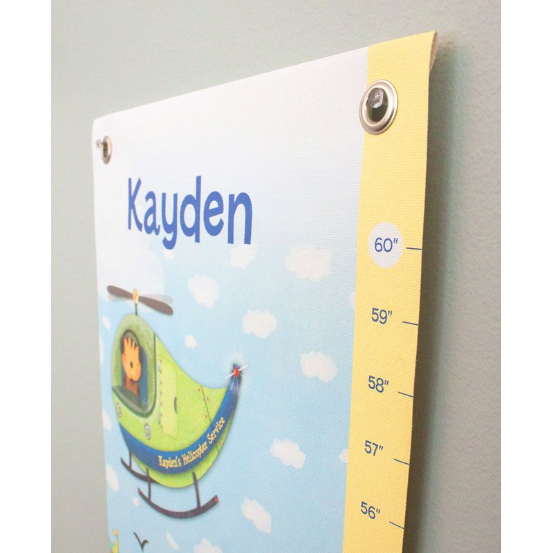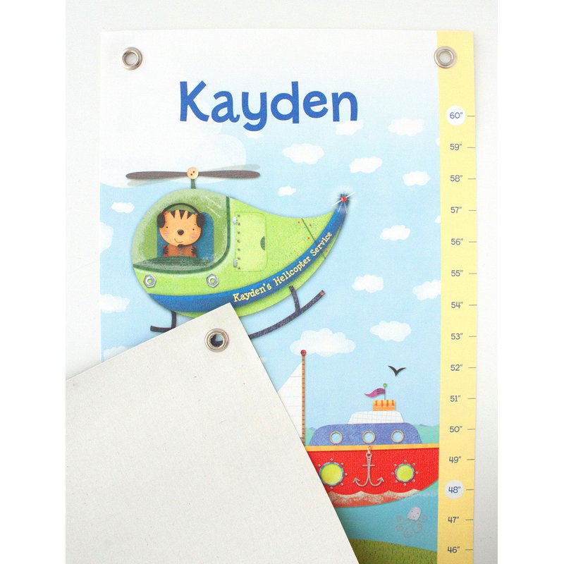 Your child will be revved up and ready to grow with this 12 by 42-inch trucks and transportation-themed Things That Go Growth Chart, featuring your child's first name! This personalized growth chart is a perfect present for baby and for families, to record their child’s growth over the years. These beautifully illustrated, high-quality growth height ruler charts are produced with artist grade canvas and have 4 grommets for easy hanging. When the parent has finished using the growth height ruler chart, it can be rolled up and kept forever! Each growth height ruler chart comes packaged in a special I See Me! present box for the perfect added touch! Each growth height ruler chart measures up to 60 inches. Made in the USA. TO HANG: Hang growth chart so that the bottom measurement marking of 24” is 2 feet off the ground. Do not hang the growth chart in direct sunlight, to avoid fading. TO USE: Use a permanent marker of your choice to write your child’s age on the growth chart, as your child grows. TO CLEAN: Wipe with a soft, dry cloth. IF IT WRINKLES: Iron on low heat if needed.