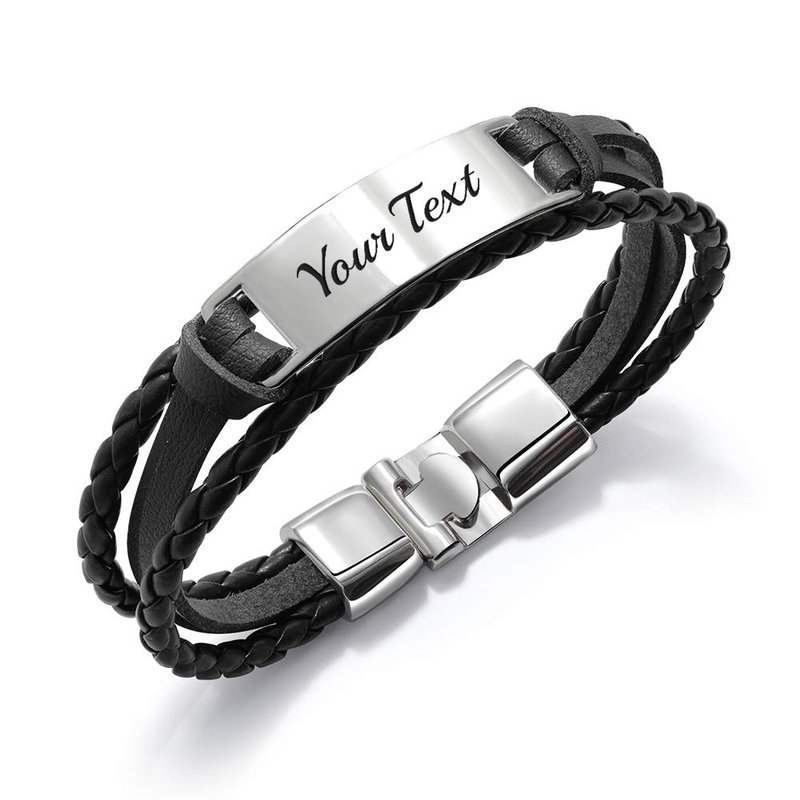 - These laser engraved leather bracelets are made in black / brown leather, stainless steel clasp and silver / black metal bar plate.
