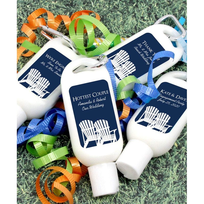 Offer your guests a reason to LOVE sun protection.... Personalized for your special event, perfectly sized for travel and completely convenient with an attached carabiner clip. These first-class favors ensure that your loved ones have no more excuses for not protecting their skin from harmful sun rays. Each eye catching container is filled with a rich yet lightweight SPF 30 sunscreen, infused with natural ingredients.... Organic Aloe Vera, Vitamin E and Sunflower Oil to nourish and soothe sun-exposed skin. Terrific for tropical destination weddings, weekend guest bags, beach barbecues, or any outdoor event!