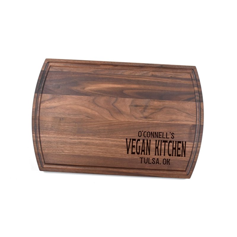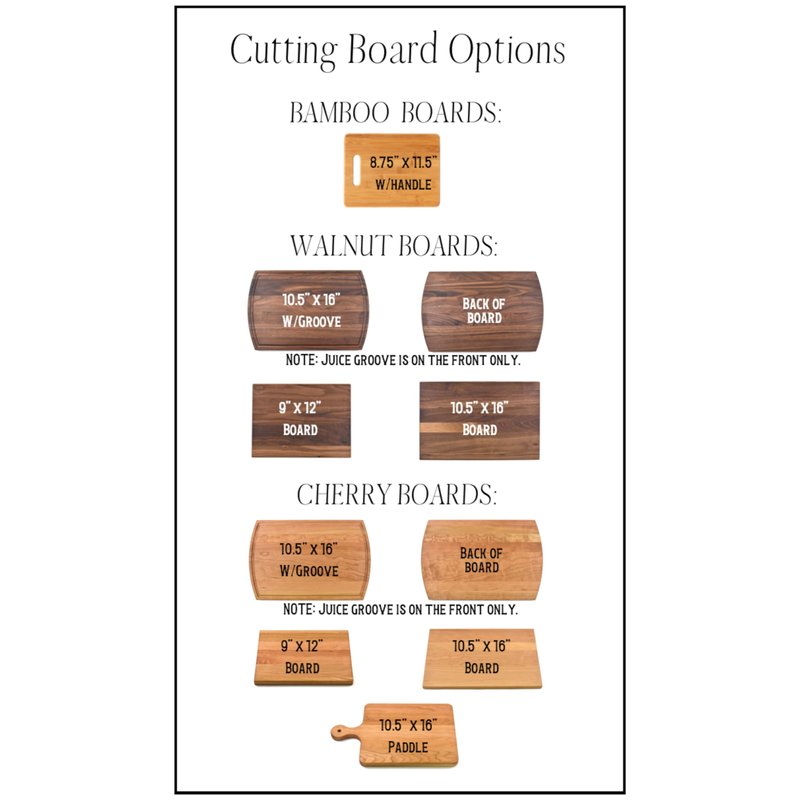 Whether used as a charcuterie serving tray for snacks or cutting board, our custom boards are the perfect addition for the home and make the perfect gift for your loved one celebrating a birthday, anniversary, new home, wedding, etc! *** FEATURES *** SIZES: We have multiple styles and sizes available. To see our current sizes available, click the drop-down menu. The photo slide contains a photo showing each side by side. Please note, the board with the juice groove only has the groove on the front side of the board. THICKNESS: BAMBOO - Approximately 1/2” Thick; CHERRY and WALNUT - Approximately 3/4” Thick Every board is unique with the grain and coloring varying throughout. CARE INSTRUCTIONS: Hand wash only with warm water. Do not soak. Please apply mineral oil throughout the board’s life (we reapply mineral oil every year to ours).