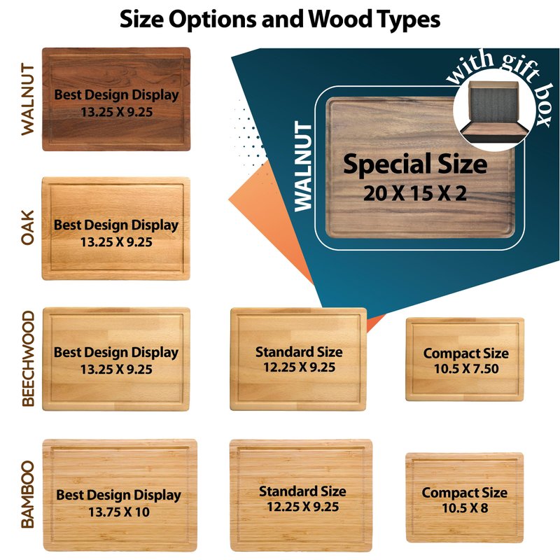 - SKILLFULLY CRAFTED BEST QUALITY DIFFERENT WOODS: Our personalized cutting boards are available in 4 wooden types and different sizes for each one, such as WALNUT, OAK, BEECH, and BAMBOO in 4 sizes; Compact (10.5" x 8"), Standard (12.25" x 9.25"), Best Design Display (13.75" x 10") and Special (20" x 15" x 2"). It's up to you to choose the one that best suits your home and kitchen.
