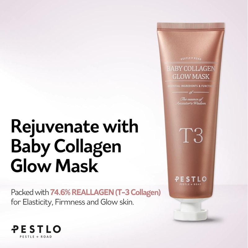 PESTLO's Baby Collagen Glow Mask, featuring an impressive 74.6% concentration of patented Reallagen (T-3 Collagen). Indulge in the luxury of a professional spa treatment in the comfort of your home. Perfect for those who are proactive about preventing the signs of aging, this mask supports your skin's health with deep hydration from hyaluronic acid, ensuring long-lasting moisture and a dewy finish.
