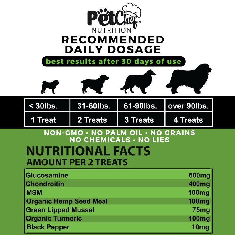 - Benefit - Easy to Administer and Delicious Taste - No more struggling with pills and tablets; Pet Chef Dog Hip Joint Supplement comes in easy-to-administer chews that dogs love. These tasty treats make it simple to provide your dog with the necessary joint support, ensuring consistent and effective supplementation for their daily comfort and long-term joint health.