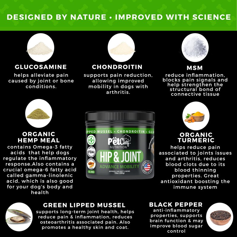 - Benefit - Premium Quality Ingredients for Optimal Joint Health - Pet Chef Dog Hip Joint Supplement for large breedds and small breeds is crafted with a blend of high-quality ingredients like glucosamine, chondroitin, and MSM, which are known for their effectiveness in maintaining and improving joint function. This powerful formula works to nourish your dog's joints, supporting mobility and flexibility, so they can enjoy every playful leap and bound.