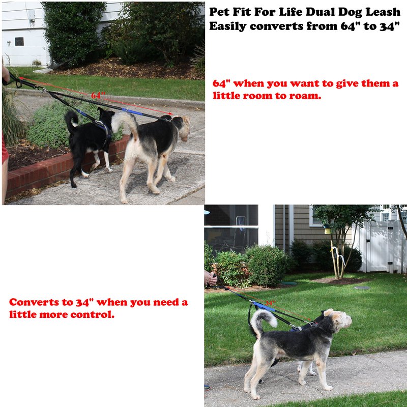 - Pet Fit For Life 64" deluxe double dog leash - the ultimate solution for walking two dogs at once! This dual dog walking leash is crafted from top-notch materials, ensuring it's built to last. With its adjustable length, ranging from 64" to 34", it's pawesome for any situation, from spacious areas for sniffing to tight spots where control is crucial. This will be the only double leash you'll ever need!