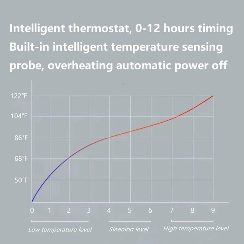 - 【3 controllable temperature modes】 Smart Constant Temperature,0-12 Hours Can Be Set Timing. 1.Low temperature:86°F-101°F 2.Deep sleep temperature:106°F-121°F 3.High temperature:126°F-141°F