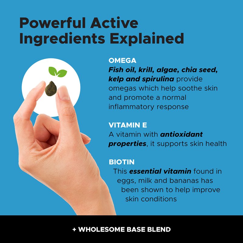 - Made with Natural Ingredients Like Krill, Salmon Oil, Chia Seeds, Biotin + Spirulina: Powerful all-natural ingredients like Kelp, Vitamin E, Salmon Oil, Algae and more are filled with antioxidants, vitamins and healthy Omega-3's and Omega-6's that contribute to healthy skin and a shiny coat.