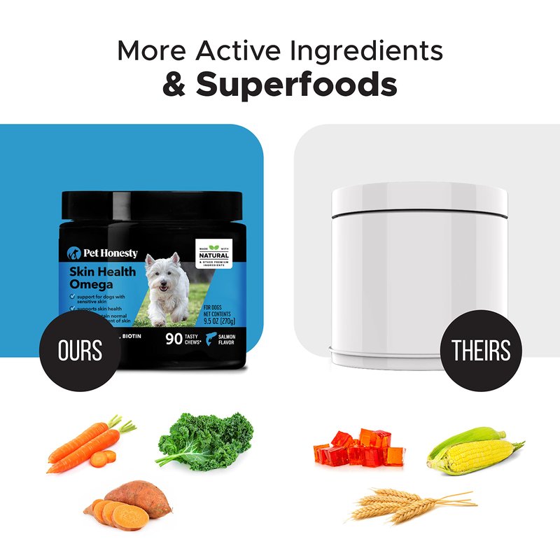 - Vet-Recommended for Healthy Skin, Coat, and Allergy-Related Skin Issues: PetHonesty's Omega SkinHealth chews are vet-recommended to promote skin and coat health, support a healthy immune response and help soothe skin-related issues associated with seasonal allergies and dry climates.
