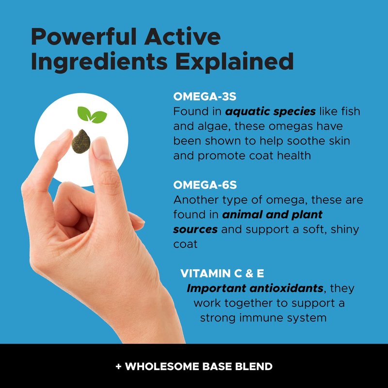 - Real Alaskan Salmon Oil - Helps Maintain Healthy Skin + Glossy Coat - These natural salmon flavored salmon oil supplement snacks are made using sustainably sourced Wild Alaskan Salmon, Kelp, Vitamin E and DHA. Each chew contains more Omega-3 and Omega-6 fatty acids than most other salmon supplements and will help maintain moisture in the skin, support skin health, a glossy coat and may help reduce unseasonal or excessive shedding.