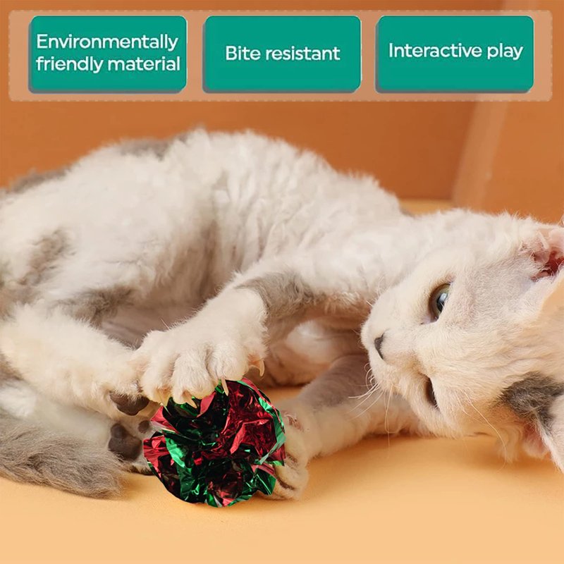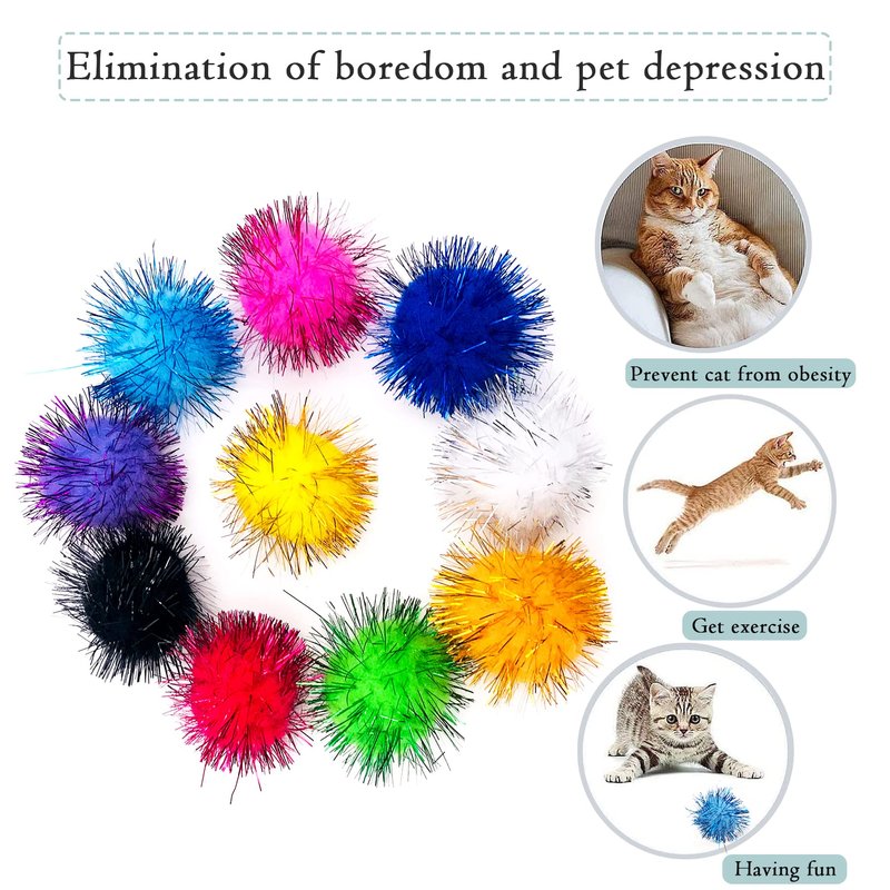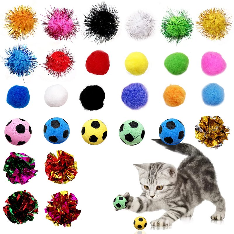 - You will get 30pcs for one pack. Color randomly. There are 10pcs golden thread balls, 10pcs pompoms balls, 5pcs paper balls and 5pcs small footballs. Your cat will have fun with the balls.