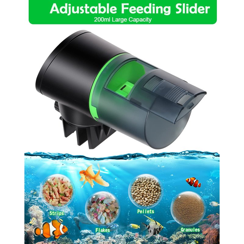 - Large Capacity & Adjustable Amount- 200ml large-capacity container fish tank automatic feeder is suitable for a variety of fish feed such as pellets, granules and powders. Simply adjust the slider to control the feeding amount.