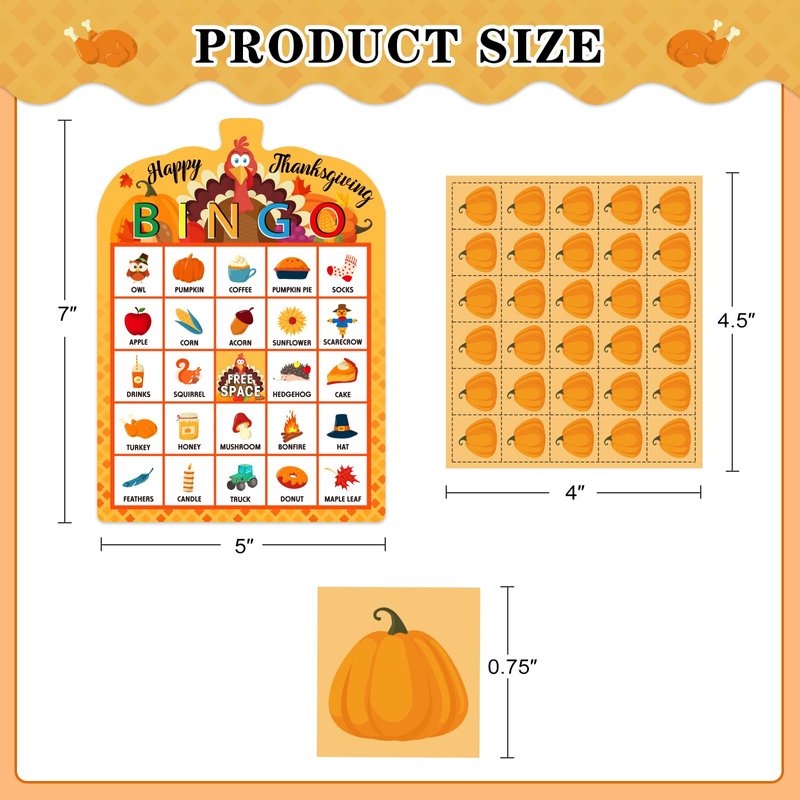- ❤️【Size & Material】: The 7" x 5" Thanksgiving bingo cards are made of durable paper cards that don't wrinkle easily and the 0.75" pumpkin player cards are made of thick cardboard, reusable.