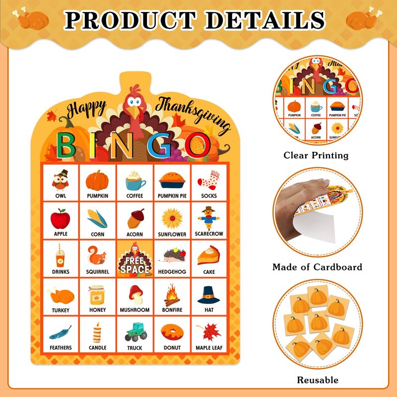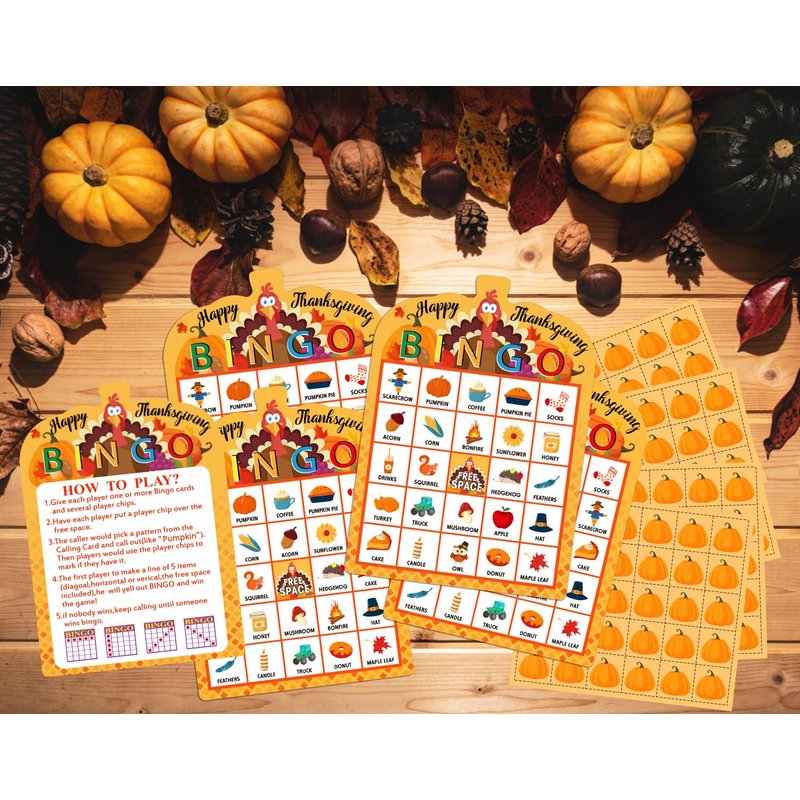 - ❤️【Thanksgiving Bingo Game Card Set】: Includes 26 sheets unique Thanksgiving bingo player cards, 26 sheets small pumpkin cards (In total 780 pcs and 30 pcs per sheet), 1 sheet calling card and 1 sheet game instruction card.