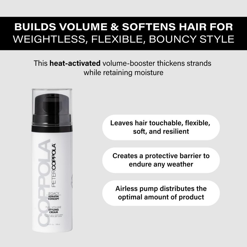 What it is: Give limp, lifeless hair fierce fullness and serious strength with the Coppola's Full Volume Styling Cream. This heat-activated volume-booster thickens strands while retaining moisture for hair that is healthy, hydrated and absolutely head-turning. What it does: Provides Intense volume Gives limp hair fierce fullness, strength, texture and shine Leaves hair touchable, flexible, soft, and resilient Keratin and Ceramides build strength and retain moisture What else you need to know: Comes in airless pump.