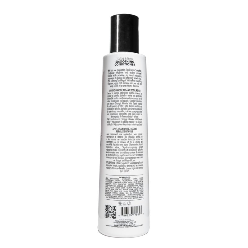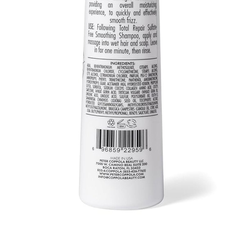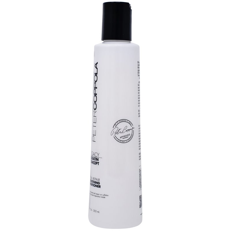 Peter Coppola Total Repair Conditioner is a lightweight daily formulation that nourishes and repairs damaged hair while restoring stronger youthful hair. The color safe keratin infused formula is best used after Keratin Treatment to maintain your hair’s moisture balance to keep your treatment looking its best and longer lasting. This balanced formula uses the power of natural keratin proteins to strengthen and repair damaged hair while restoring elasticity. The pH-balanced element keeps the hair cuticle tight and instantly detangles hair, reducing the appearance of frizzes and split ends for smooth sleek results. This protein-rich and pH balanced formula repairs and replaces proteins on the outside of the hair shaft to fill and seal damage. This repaired hair shaft gives the surface of your hair a shiny and healthy finish making the color appear more vibrant.