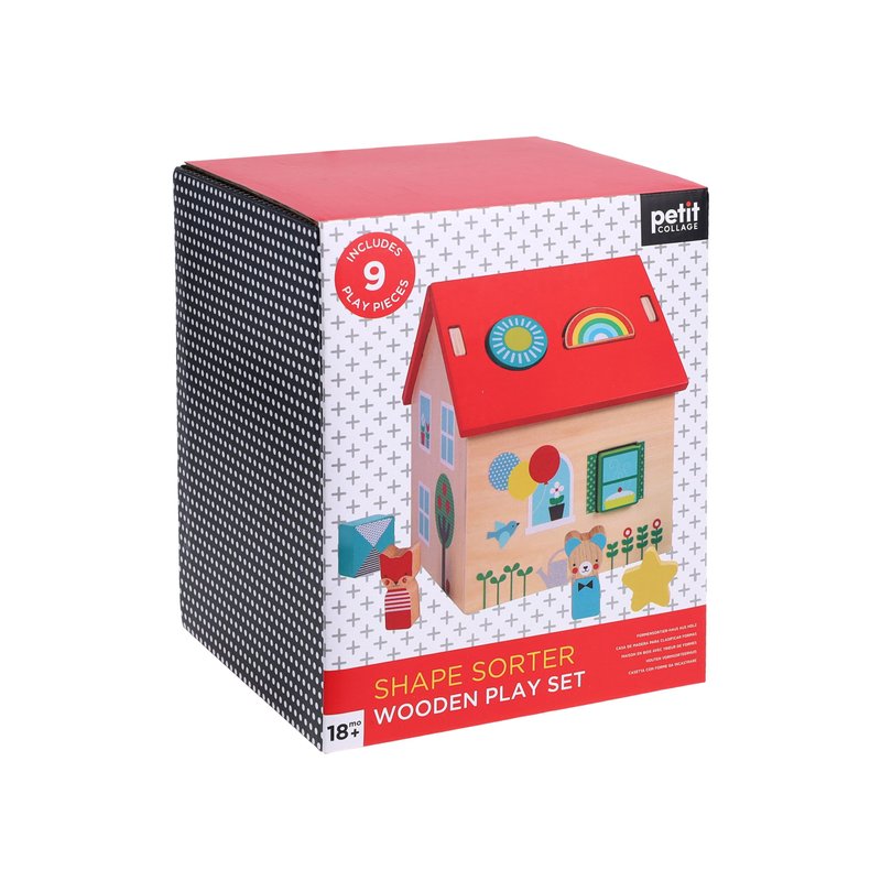 - WOODEN SHAPE SORTER – Little ones can get their house in order with this Shape Sorter Wooden Play Set from Petit Collage. With bold, colorful shapes and cheerful animal friends, this shape-sorter house is a perfect fit!