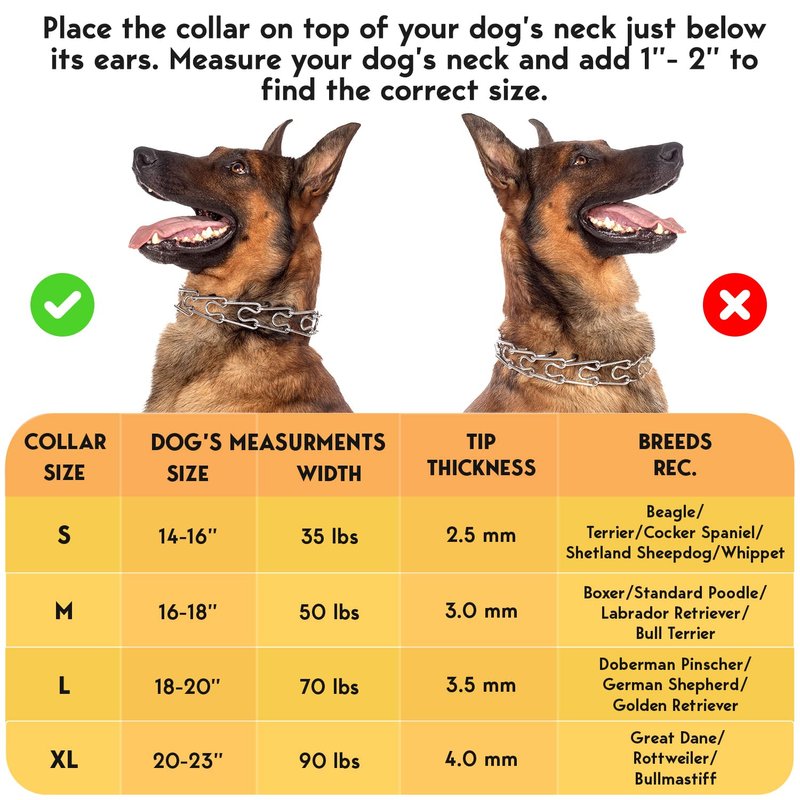 - Built to Last for Years: Made from high-quality stainless steel, this durable pronged collar has a rust-free and water-resistant construction that will provide years of use. Ideal not just for professional dog trainers, our easy-to-use dog collar includes easy-to-follow instructions inside the box for hassle-free use of every dog owner! Our chain collar comes with 2 extra links and 4 rubber caps to let you quickly adjust the collar's size for a comfortable, precise fit around your dog's neck.