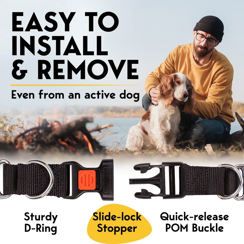 - Designed to Prioritize Your Pet's Comfort: Featuring chrome-plated links equipped with soft silicone caps, our anti-barking, anti-pulling collar stays in place as your dog moves. The smooth, rounded prongs won't dig into a canine's skin—eliminating the risk of possible skin irritation. Built with a quick-release POM buckle snap clip, you'll have no trouble putting on or removing the collar, even from an active dog! Also constructed with a sturdy D-ring, it allows secure attachment of a leash.
