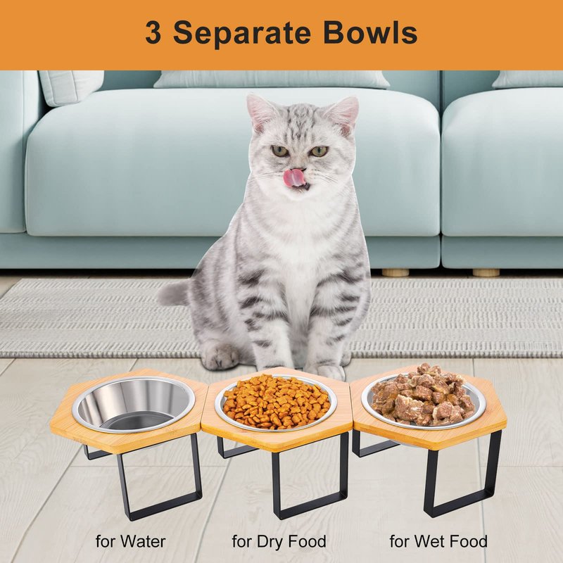 Cats bowls has 3 separate bowls for cats food and water. If you have several cats, you can put them together to eat; If cats don't want to share or eat close to each other, you can also separate them to give them individual space and privacy.