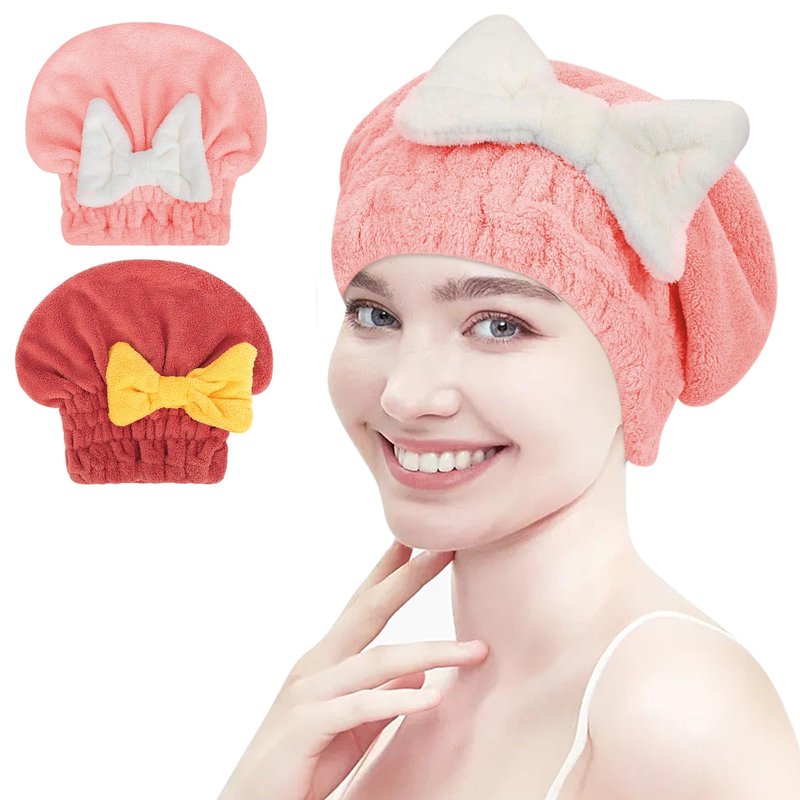 PetsHome Hair Drying Cap 2 Pack Microfiber Hair Drying Towels, Super Absorbent Head Wrap with Bowknot Shower Cap for Girls and Women-Pink+Red