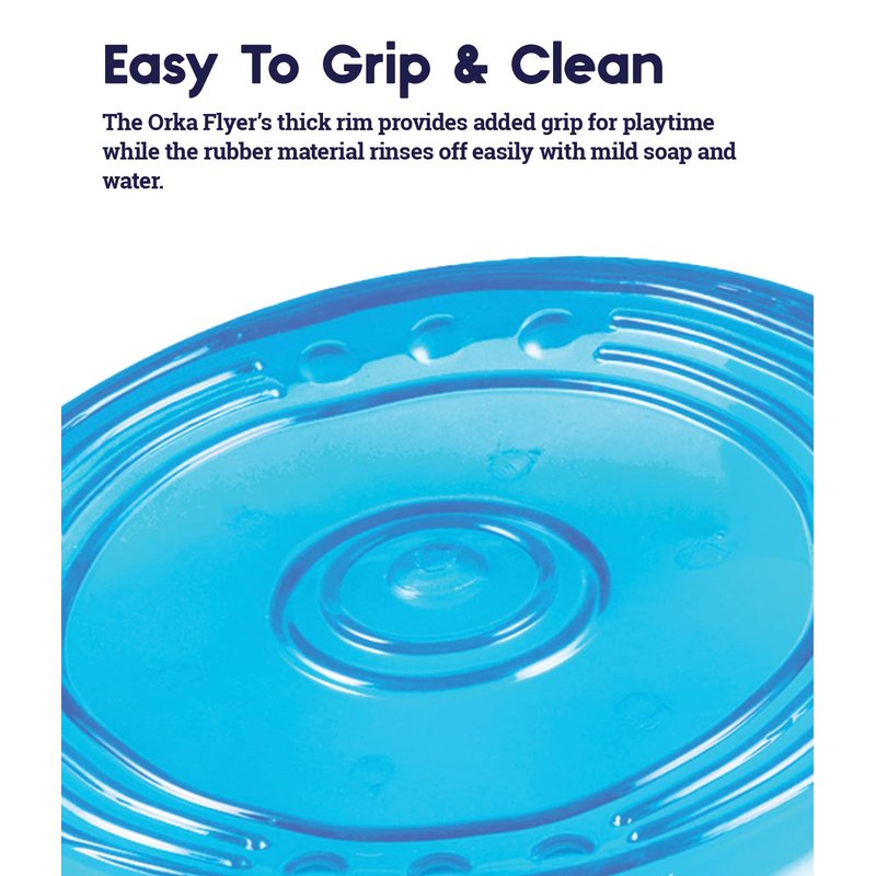 - EASY TO GRIP & CLEAN: The Orka Flyer's thick rim provides added grip for playtime while the rubber material rinses off easily with mild soap and water.