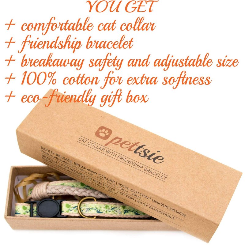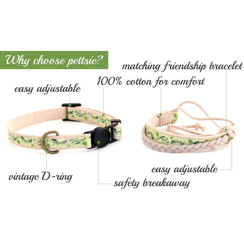 Pettsie Cat Collar Set, Breakaway Safe Buckle, Matching Friendship Bracelet, Pet-Friendly Carton Box for Kitty Lovers, Soft Cotton for Sensitive Skin, Easy Adjustable 7.5-11.5 Inches, Green