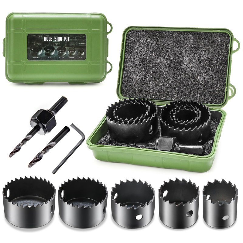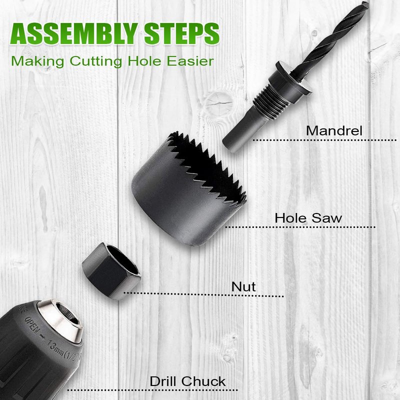 - PACKAGE INCLUDES: Hole saw kit includes 5pcs saw blades, 7/8" (22mm), 1-1/4" (32mm),1-1/2" (38mm), 2" (51mm),2-1/8" (54mm), 1x mandrels, 2x drill bits, 1 x hex key, 1x package box.
