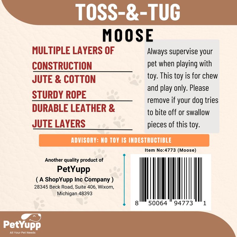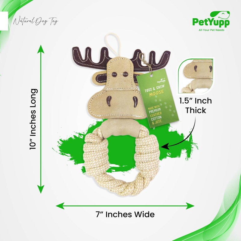 PetYupp Cotton & Jute Toss - Tug Dog Toy with Genuine Leather - for Teething Puppy, Dental Health, Aggressive Chewer, Tug-of-War Dog Toys and All Dog Sizes (Toss & Tug Dog Toy - Moose), Brown