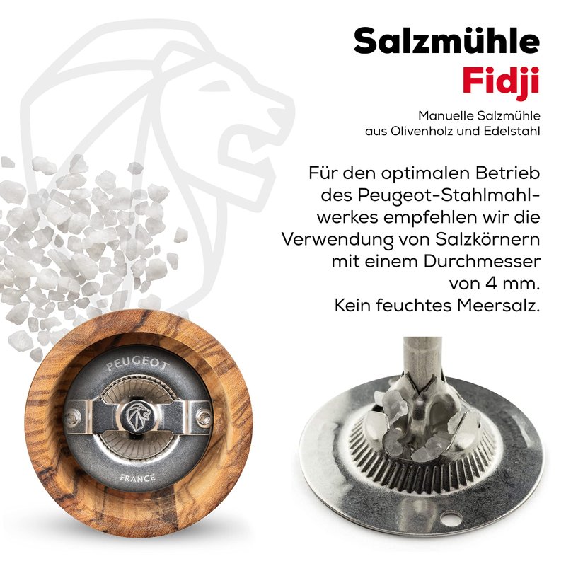 - To get the best out of your Peugeot salt grinding mechanism, you should use: salt with a diameter of 4 mm (3/16") or less; Dry coarse salt: Dry Sea salt or rock salt