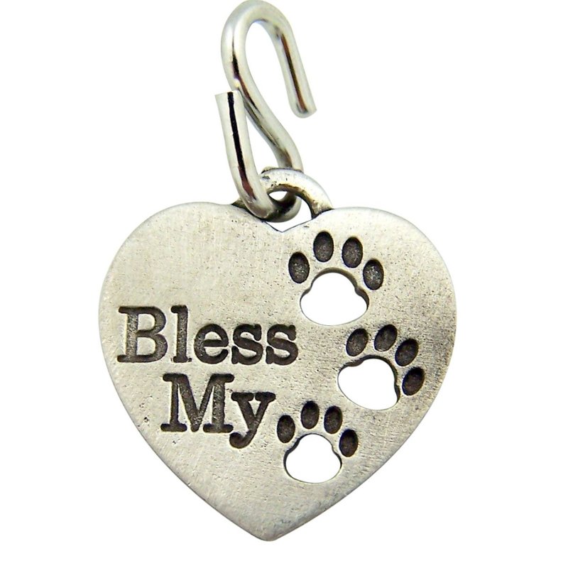 Pewter Heart Shape Bless My Pet Dog Cat Collar Charm with Paw Prints, 1 Inch