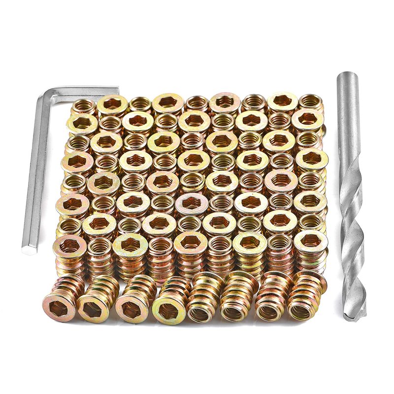 - 80 pieces 1/4"-20 furniture screws threaded inserts for wood furniture. Comes with 9.0 mm white steel twist drill and 6mm hex spanner.