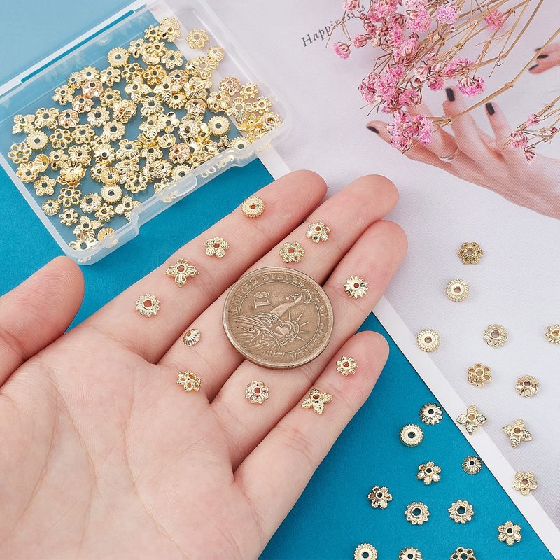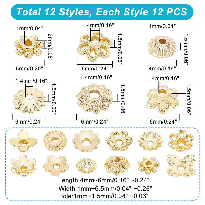 - 12 Styles Available: package includes 144pcs golden metal flower caps in 12 styles, each style 12pcs; different styles can meet your various needs in DIY project. All bead caps are packed in a clear plastic container box for easy storage.