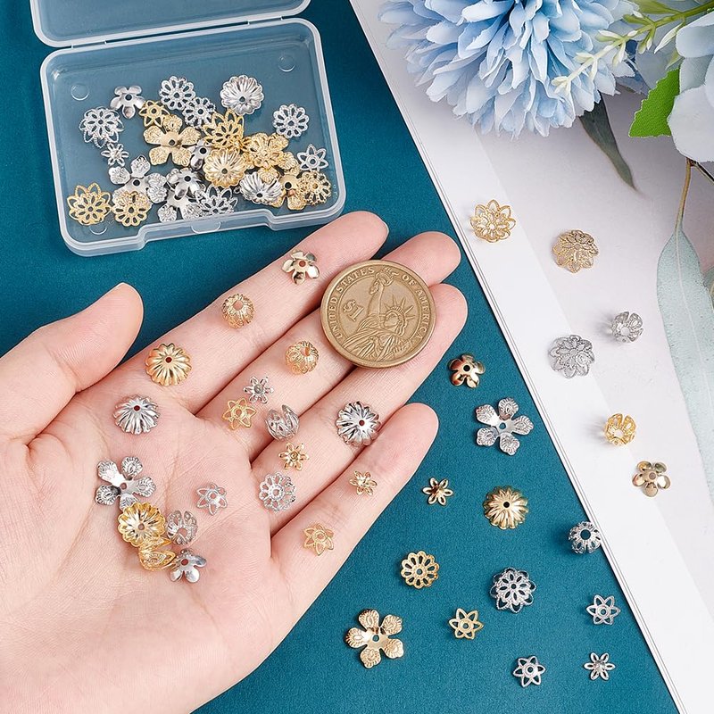 Specification: Quantity: 64pcs/set Material: 24k gold plated brass Color: golden, platinum Size: Flower: about 7x2.5mm, hole: 1.2mm, 2 colors, 4pcs/color, 8pcs; Flower: about 8.5x2mm, hole: 1.2mm, 2 colors, 4pcs/color, 8pcs; Flower: about 7x6x1.5mm, 2 colors, 4pcs/color, 8pcs; Flower: about 8.5x2mm, hole: 1.5mm, 2 colors, 4pcs/color, 8pcs; Flower: about 13x13.5x0.5mm, hole: 1.5mm, 2 colors, 4pcs/color, 8pcs; Flower: about 7x7mm, hole: 2mm, 2 colors, 4pcs/color, 8pcs; Plastic Bead Containers: about 6.8x5.2x1.1cm, 1pc. Features: Multi Usages: these end caps are ideal for beading/art craft making, can be used for making earrings, bracelets, necklaces, pendants, anklets, ornaments, belt, keychain, jewelry DIY and DIY craft making.