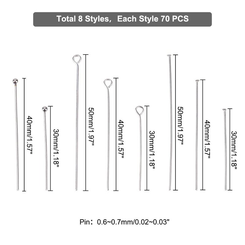 Specification: Quantity: 560 pcs/set. Color: Stainless Steel Color. Material: 304 Stainless Steel . Size: Eye Pin: 30mm, Pin: 0.6mm, Hole: 2mm, 70pcs; Eye Pin: 40mm, Pin: 0.6mm, Hole: 2mm, 70pcs; Head pins: 50x0.6mm, 70pcs; Head pins: 30x0.6mm, 70pcs; Head pins: 40x0.6mm, 70pcs; Ball Head pins: 40x0.7mm, 70pcs; Ball Head pins: 30mm; Pin: 0.7mm, 70pcs; Eye Pin: 50mm, Hole: 2mm; Pin: 0.7mm, 70pcs; Cartons: 208x35mm, 1pc; Containers: 7.4x7.2x1.7cm, 1pc. Features: ---Great for making small connector or make your own beaded chain.Simply slide beads onto eyepin and string the beads together. ---The eye pin is strung through the bead or pendant, its eye can be used to link it to other components of the jewelry and the excess wire peaking out. ---There is a loop atend, its eye can be used to link it to other components of the jewelry, you can easily create beaded links and dangles for your designs. The other end can be finished with loops and wraps. ---Great for DIY your special & unique jewelry, excellent size for suspending small items from delicate necklaces, bracelets, anklets. ---Learn simple and exciting techniques to make craft just like you see in department stores, affordable way for DIY to get great style. Customer support: If you have any problem with our product, you can click on the "Seller Contact" button in your Amazon account to send us an email. we will be happy to help you and we will reply as soon as possible.