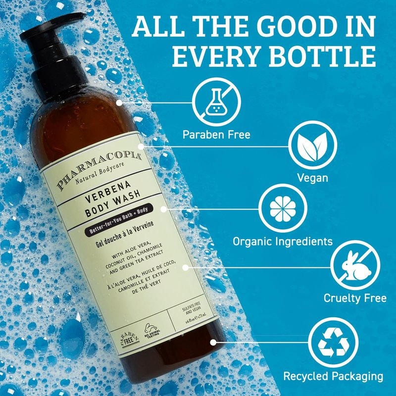 Pharmacopia Verbena Body Wash - Natural Shower Gel, Moisturizing and Nourishing Body Cleanser - Infused with Organic Aloe Vera, Coconut Oil, and Green Tea Extract - Vegan, and Cruelty-Free, 16 oz