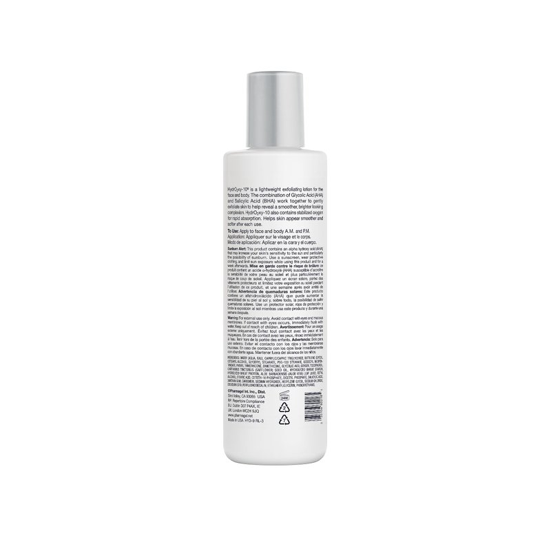 Pharmagel HydrOxy-10 is a moisturizing lotion concentrate for the face and body that helps your skin appear lifted and firmed. HydrOxy-10 contains both Glycolic Acid (AHA) and Salicylic Acid (BHA). BHA works as an exfoliator to help skin look rejuvenated. Glycolic Acid offers gentle, natural exfoliation. HydrO2xy-10 also contains stabilized oxygen for rapid absorption to help skin appear revitalized, firmed, and rejuvenated. The appearance of wrinkles and fine lines are diminished. Key Ingredients: Salicylic Acid (BHA) – highly potent acid, with no irritation, promoting exfoliation without redness or drying. This ingredient encourages cleansing. Tocopherol Acetate (Vitamin E) – improves the appearance of damaged and aging skin. Safflower Oil – provides additional moisture to help reduce the appearance of the effects of everyday stresses. Glycolic Acid (AHA) – derived from sugar cane, this remarkable ingredient helps skin appear smoother. Aloe Vera (Aloe Barbadensis) – excellent moisturizing properties. Stabilized Oxygen – helps skin look renewed.