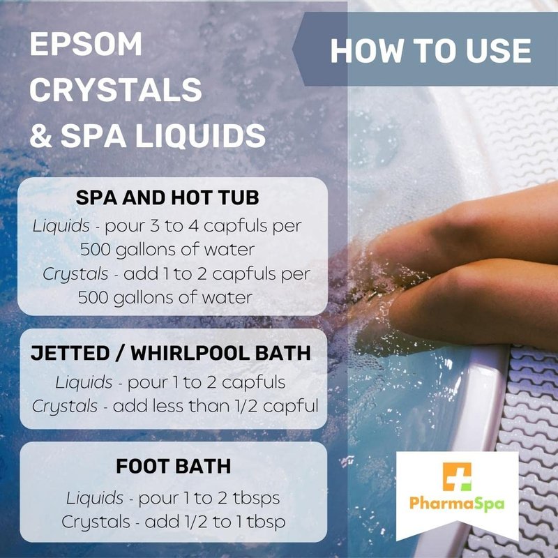 - [HOT TUB & ALL JETS SAFE] - Proudly made in Canada, PharmaSpa is the first fragrance company specialized in therapeutic aromatherapy Epsom salt Crystals and Liquids that are safe for hot tubs and jetted baths. They are oil free, do not foam or bubble, nor do they leave any oily residue. Our relaxing products help mask chemical odors but will not affect the PH