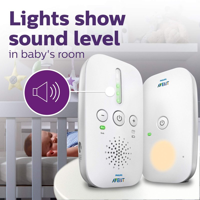 - Five sound activated LED lights show sound Level in baby's room even when the parent unit is muted