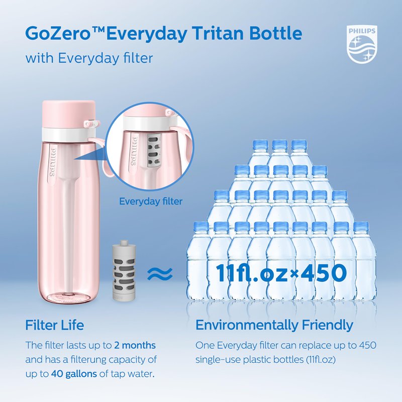 Philips GoZero Everyday Filtered Water Bottle with Philips Everyday Water Filter, BPA-Free Tritan Plastic, Purify Tap Water Into Healthy Drinking Tasting Water, 22 oz, Pink