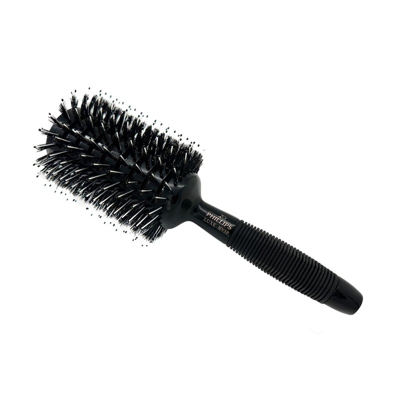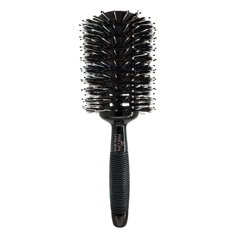 The Phillips Brush Monster Vent 3 Poly Tip from the Luxe Line is the round styling brush of choice for salon professionals. The round brush head of this luxurious brush consists of natural Boar’s hair bristles mixed with Poly-Tipped Nylon Bristles and is fully vented to provide the best styling experience & provide fast, efficient drying results. The Poly-Tipped bristles provide penetration to the scalp, making quick work of tangled or thick hair! The head is also hollow to reduce the handling weight. The handle is countered and topped with a rubber grip to provide the best comfort without sacrificing control while you are styling. This brush is from the Luxe Series by Phillips Brush Co. Sleek black & gold colorway offers a look of elegance and refined taste. Not the right size? Check out the full Luxe Series by Phillips Brush!